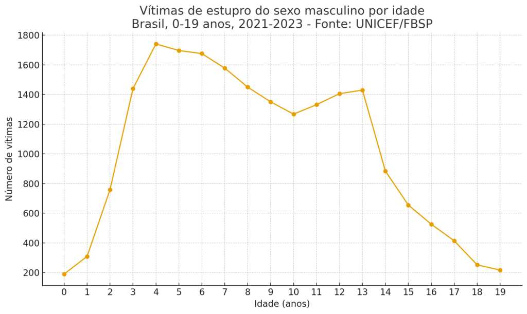 Os dados por idade do relatório UNICEF/FBSP ajudam a visualizar essa realidade. Ao somar os três anos analisados, a curva de vítimas do sexo masculino começa a subir com força a partir dos 3 anos de idade, atinge o ápice entre 4 e 5 anos, permanece muito alta até os 12 ou 13, e depois cai.