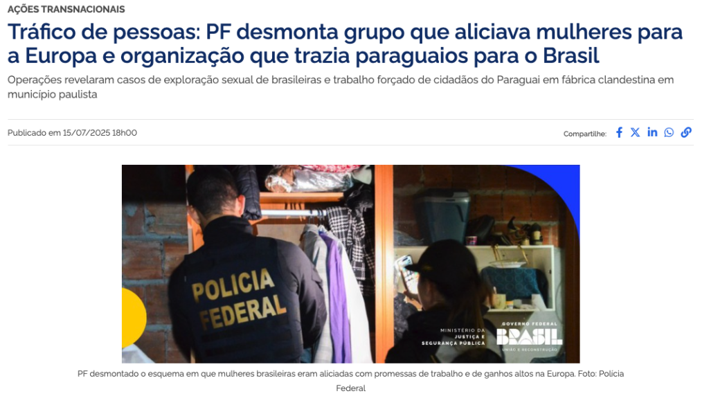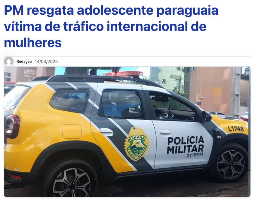 [1] UNODC. (2024). Relatório Global sobre Tráfico de Pessoas 2024. Escritório das Nações Unidas sobre Drogas e Crime. Acessado em: https://www.unodc.org/cofrb/pt/noticias/2024/12/relatrio-global-do-unodc-sobre-trfico-de-pessoas_-nmero-de-vtimas-detectadas-aumenta-25–com-mais-crianas-exploradas-e-casos-de-trabalho-anlogo–escravido-em-alta.html [2] OIT & UNICEF. (2025). Apesar dos avanços, o trabalho infantil ainda afeta 138 milhões de crianças no mundo. Organização Internacional do Trabalho. Acessado em: https://www.ilo.org/pt-pt/resource/news/apesar-dos-avancos-o-trabalho-infantil-ainda-afeta-138-milhoes-de-criancas [3] Departamento de Estado dos EUA. (2025). 2025 Trafficking in Persons Report: Paraguay. Acessado em: https://www.state.gov/reports/2025-trafficking-in-persons-report/paraguayTráfico Humano na Fronteira do Paraguai, Tráfico Humano na Fronteira do Paraguai, Tráfico Humano na Fronteira do Paraguai, Tráfico Humano na Fronteira do Paraguai, Tráfico Humano na Fronteira do Paraguai,