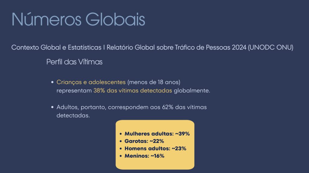 O mais recente Relatório Global sobre Tráfico de Pessoas do UNODC, publicado em 2024, confirma a tendência de agravamento da situação. O documento revela um aumento de 25% no número de vítimas detectadas globalmente em 2022, em comparação com os níveis pré-pandemia de 2019. As crianças, em particular, estão cada vez mais na mira dos traficantes, representando agora 38% de todas as vítimas detectadas, um aumento de 31% no mesmo período [1].