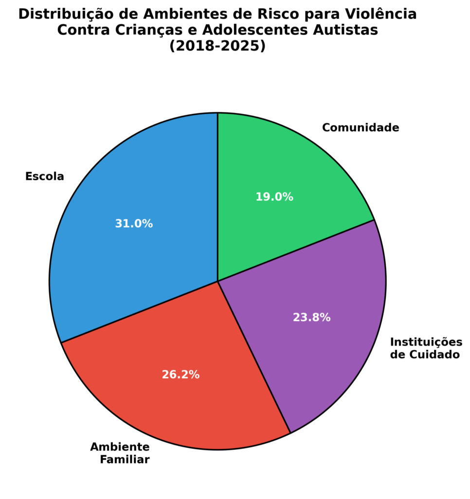 Gráfico 2: Distribuição percentual dos ambientes onde a violência contra crianças e adolescentes autistas é mais recorrente. Fonte: Análise de estudos de caso e relatórios (2018-2025).