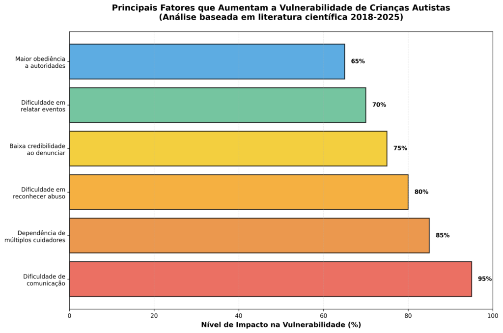 Gráfico 5: Principais fatores que contribuem para o aumento da vulnerabilidade de crianças autistas à violência, com destaque para as dificuldades de comunicação. Fonte: Análise da literatura científica (2018-2025).