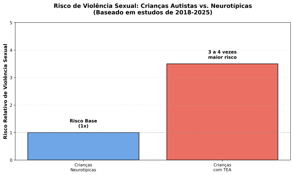 Gráfico 4: Comparação do risco relativo de violência sexual entre crianças neurotípicas e crianças com TEA, evidenciando um aumento de 3 a 4 vezes no risco para o segundo grupo. Fonte: Baseado em estudos de prevalência (2018-2025).