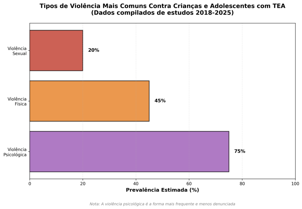 Gráfico 3: Prevalência estimada dos tipos de violência mais comuns contra crianças e adolescentes com TEA. A violência psicológica se destaca como a mais frequente. Fonte: Compilação de dados de pesquisas (2018-2025).