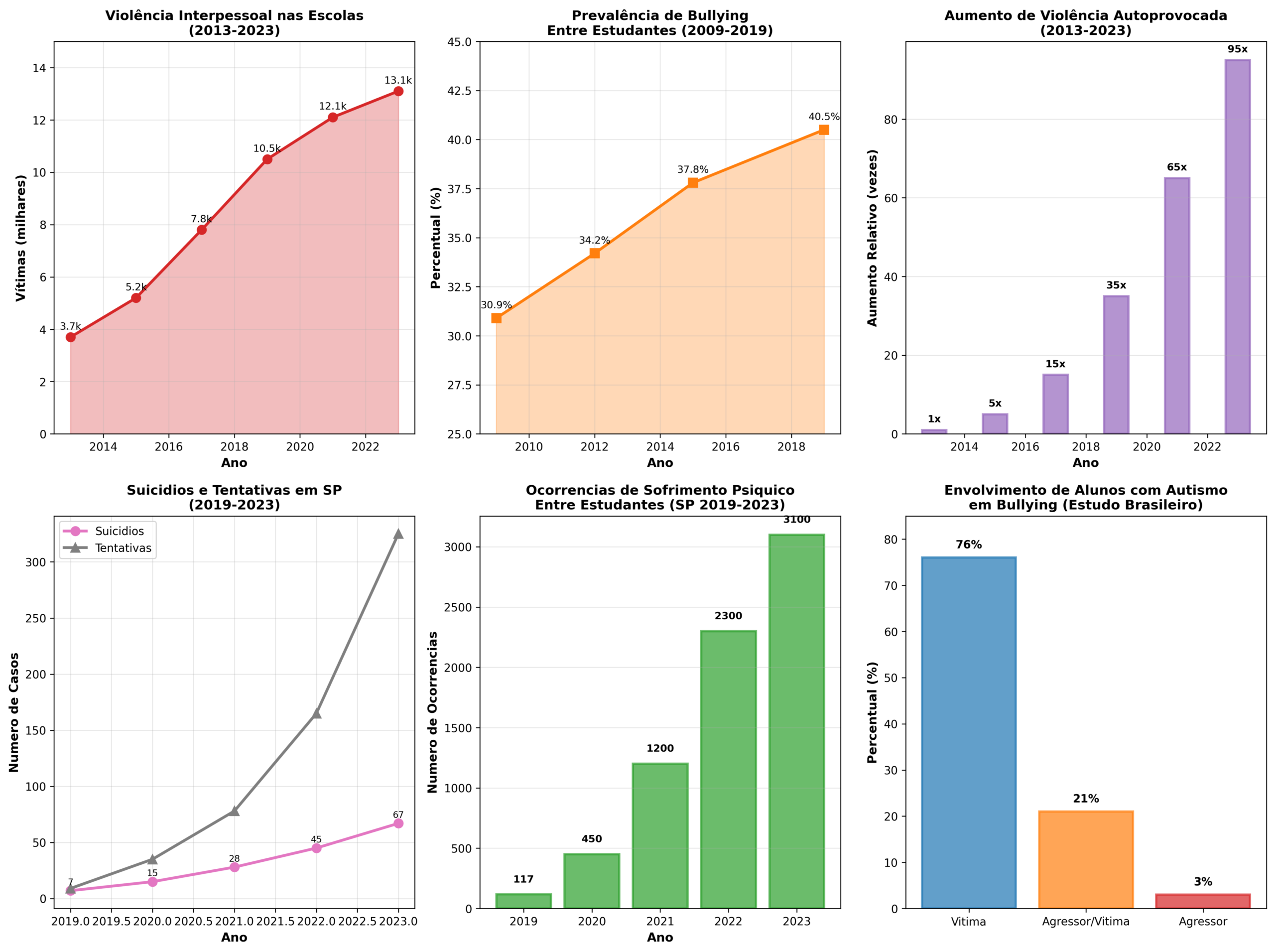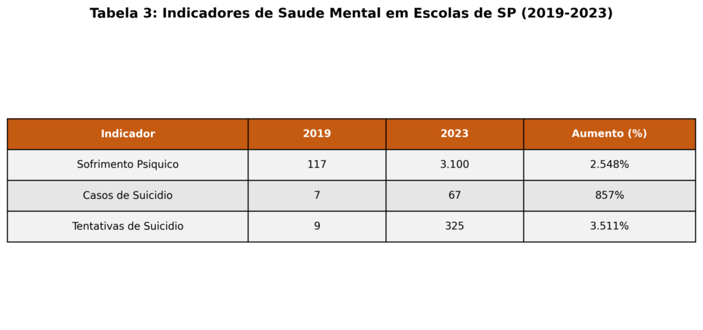 O aumento da violência não se restringe apenas às interações entre pares. Um aspecto alarmante é o crescimento da violência autoprovocada entre os estudantes. Entre 2013 e 2023, os casos desta natureza aumentaram 95 vezes, um indicador do profundo sofrimento psíquico que pode estar associado ao ambiente escolar [1]. No estado de São Paulo, por exemplo, os registros de suicídio entre estudantes passaram de 7 em 2019 para 67 em 2023, enquanto as tentativas de suicídio saltaram de 9 para 325 no mesmo período [1].