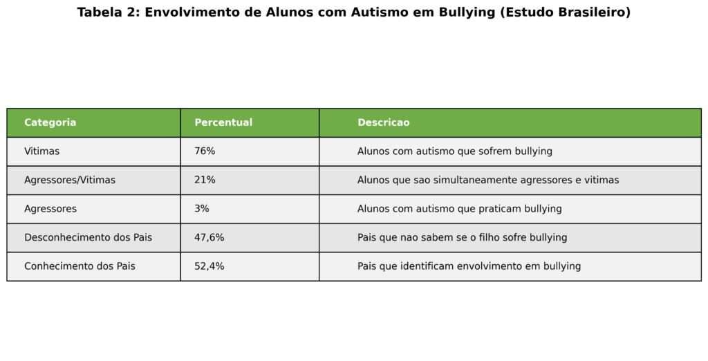 No Brasil, a situação não é diferente. Um estudo conduzido por Falcão et al. (2021) aprofundou a análise do envolvimento de alunos com TEA em situações de bullying, coletando informações de múltiplas fontes: os próprios alunos, seus pais e professores [3]. Os resultados mostram uma complexa teia de percepções e realidades. Enquanto 63% dos alunos com autismo se declararam vítimas de bullying, apenas 52,4% dos pais tinham conhecimento do envolvimento de seus filhos em tais situações. Dentre os pais que sabiam, 76% identificaram seus filhos como vítimas, 21% como agressores e vítimas simultaneamente, e 3% apenas como agressores [3].